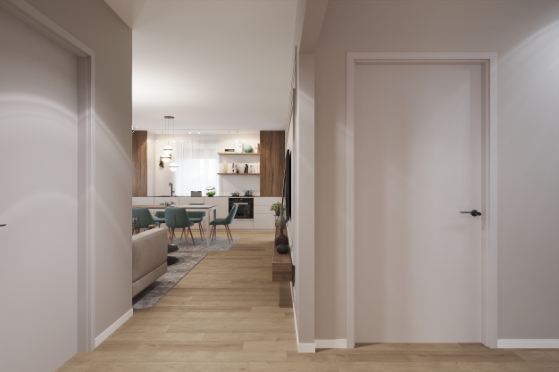 A lakások között hanggátló tégla kerül beépítésre, a födémben hangszigetelő réteg kerül az esztrich beton alá. Ezen hanggátló falak elé ahol szükséges gipszkarton előtétfalat terveztünk hangszigeteléssel. A lakásokat megközelítő folyosó a nagy forgalmú lépcsőháztól leválasztásra kerül. A tervezés során kiemelt figyelmet fordítottunk a lefolyók és szellőzők lakáson kívüli elhelyezésére, így azokban strang nem halad keresztül. Ezen szükséges gépészeti vezetékek a folyosóra kerülnek. A villamos elosztószekrény külön eldobozolásra kerül a hanggátló fal védelme érdekében. A bejárati ajtó a szabványt meghaladó akusztikai érték alapján kerül megrendelésre.